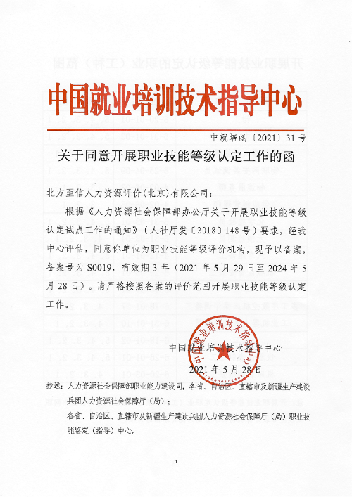 5月28日,人力資源社會(huì)保障部中國就業(yè)培訓(xùn)技術(shù)指導(dǎo)中心發(fā)布了《關(guān)于同意開展職業(yè)技能等級(jí)認(rèn)定工作的函》(中就培函〔2021〕31號(hào)),北方至信人力資源評(píng)價(jià)(北京)有限公司(以下簡(jiǎn)稱“北方至信”)成為首家央企全國性社會(huì)培訓(xùn)評(píng)價(jià)組織職業(yè)技能等級(jí)認(rèn)定機(jī)構(gòu)。